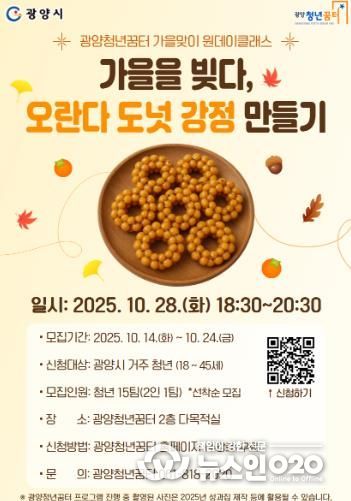 (뉴스인020 = 김성길 기자) 광양시는 청년들의 여가문화 활성화와 정서적 힐링을 위한 프로그램의 일환으로, 광양청년꿈터에서 가을맞이 원데이클래스 ‘가을을 빚다 – 오란다 도넛 강정 만들기’ 참가자를 모집한다고 14일 밝혔다.