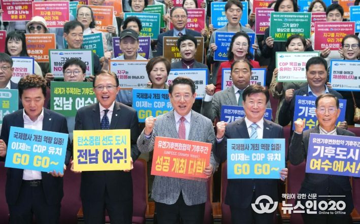 (뉴스인020 = 김성길 기자) 전라남도는 14일 여수 진남문예회관에서 ‘2026년 유엔기후변화협약 기후주간’ 국내 개최지 공모에 여수가 선정된 것을 축하하고, 행사 성공개최를 다짐하는 기념행사를 열었다.