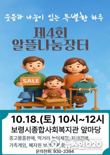 (뉴스인020 = 김성길 기자) 보령시종합사회복지관은 오는 10월 18일 오전 10시부터 12시까지 복지관 앞마당에서 ‘제4회 알뜰나눔장터’를 개최한다.