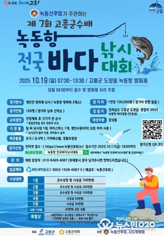 (뉴스인020 = 김성길 기자) 고흥군은 오는 10월 19일 도양읍 녹동항 일원에서 ‘제7회 고흥군수배 녹동항 전국바다낚시대회’를 개최한다고 밝혔다.