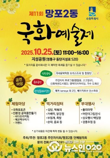 (뉴스인020 = 기자) 수원시 영통구 망포2동 주민자치회는 오는 10월 25일, 영통구 지성공원에서 제11회 국화예술제를 개최한다. 태장동부터 이어져온 이번 축제는 지역주민이 함께 어울리고 즐길 수 있는 참여형 문화행사로 국화포토존, 친환경 공예품만들기 체험부스, 먹거리 장터, 플리마켓 등 다채로운 프로그램이 마련될 예정이다.