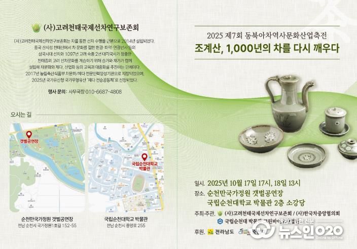 (뉴스인020 = 김성길 기자) 전통 제다문화의 역사와 미학, 예술적 감성을 아우르는 ‘제7회 동북아 차역사문화산업축전’이 (사)고려천태국제선차연구보존회 주관으로 오는 17일부터 18일까지 순천만국가정원 갯벌공연장과 국립순천대학교 박물관에서 열린다.