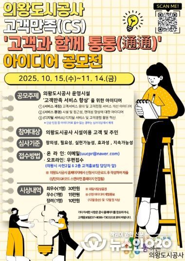 (뉴스인020 = 김성길 기자) 의왕도시공사는 고객만족(CS) 아이디어 공모전‘고객과 함께 통통(通通)’을 추진한다고 밝혔다.