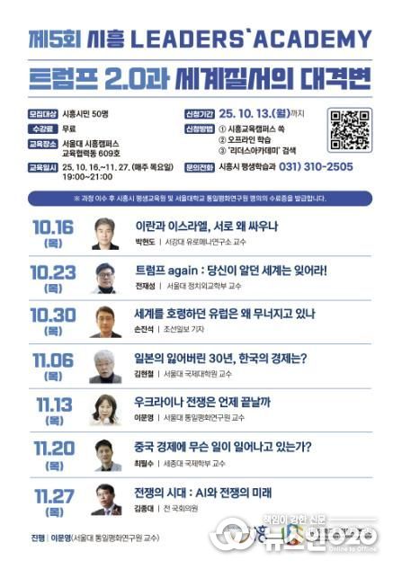 (뉴스인020 = 김성길 기자) 시흥시는 서울대학교 본부 직속 연구기관인 통일평화연구원과 함께 '제5회 시흥리더스아카데미'를 10월 16일에 개강한다. 이번 아카데미는 '트럼프 2.0과 세계질서의 대격변'을 주제로 급변하는 국제 정세와 세계 질서의 흐름에 대한 시민들의 폭넓은 이해를 돕고자 마련됐다.