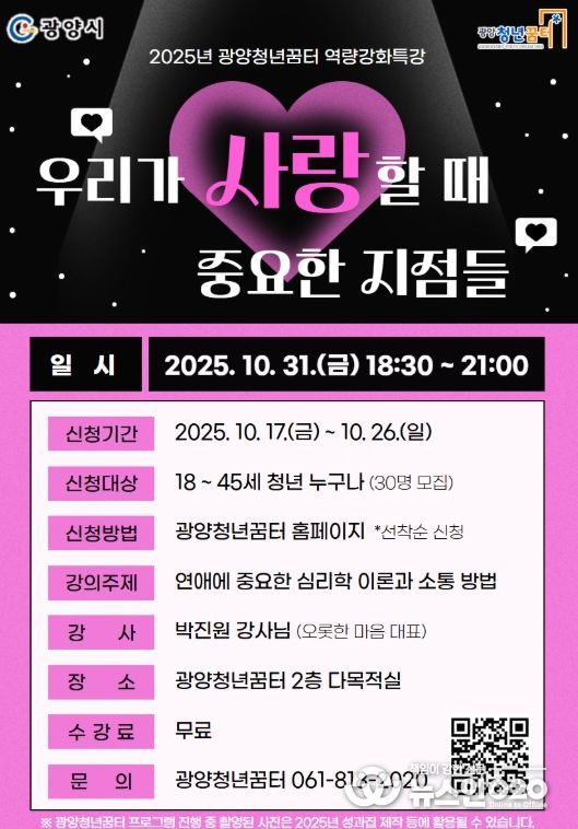 (뉴스인020 = 김성길 기자) 광양청년꿈터는 청년들의 건강한 관계 역량 강화와 정서적 성장을 지원하기 위해 오는 10월 31일 ‘오롯한 마음’ 박진원 대표를 초청해 연애 특강을 진행한다고 밝혔다.