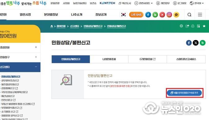 (뉴스인020 = 김성길 기자) 전라남도 나주시가 국민신문고 서비스 중단으로 인한 시민 불편을 최소화하기 위해 ‘새올 전자민원창구’를 임시 운영한다.