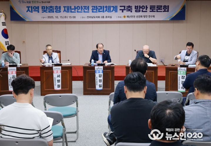 (뉴스인020 = 김성길 기자) 전라남도의회 의원 연구단체인'재난안전 선진화 방안 연구회'는 지난 10월 15일 전라남도의회 초의실에서 강정일 대표의원(광양2) 주재로 ‘지역 맞춤형 재난안전 관리체계 구축 방안’에 대한 토론회를 개최했다.