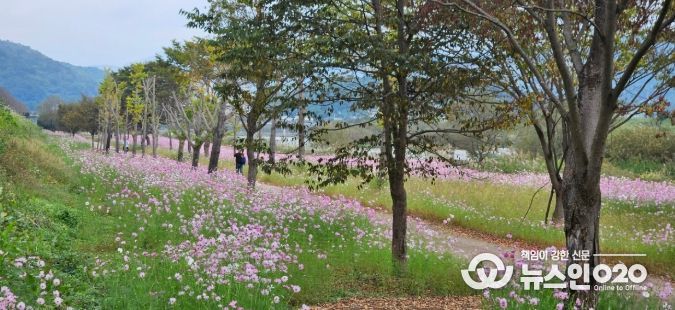 대황강변을 따라 흐드러지게 핀 코스모스는 맑은 공기와 이슬을 머금고 자라 여느 도로가의 코스모스보다 더욱 선명하고 생생한 빛깔을 자랑한다.