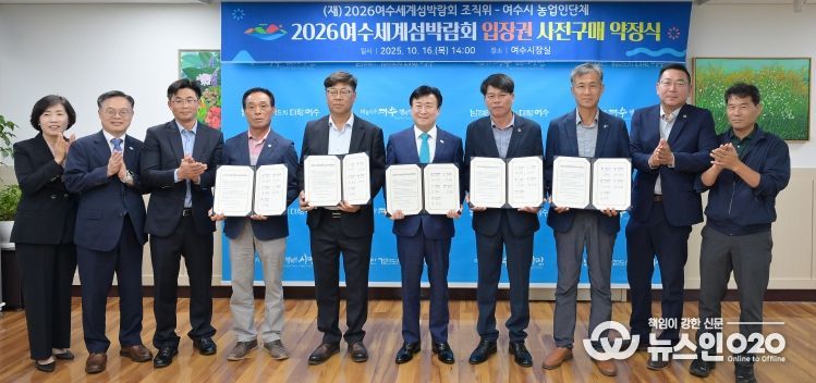 (뉴스인020 = 김성길 기자) (재)2026여수세계섬박람회조직위원회는 지난 16일 여수시청 시장실에서 여수 농업인 단체와 2026여수세계섬박람회 입장권 1,500만 원 규모의 사전 구매 약정을 체결했다고 밝혔다.