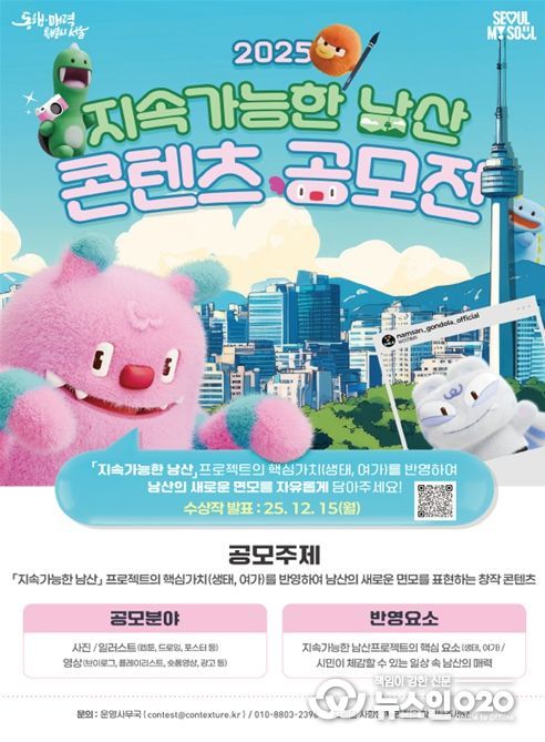 (뉴스인020 = 김성길 기자) 서울시는 시민들의 창의적인 시선을 통해 남산의 생태와 여가를 새롭게 조명하고 지속가능한 남산의 미래를 함께 그려나가기 위해 '2025 지속가능한 남산 콘텐츠 공모전'을 개최한다고 밝혔다.