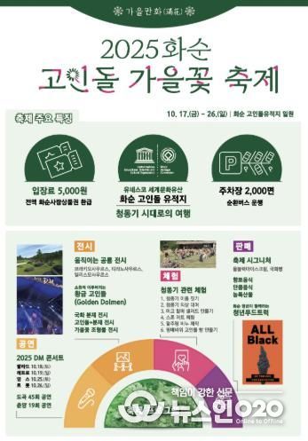 (뉴스인020 = 김성길 기자) 화순군은 10월 17일부터 10월 26일까지 10일간 개최되는 ‘2025 화순 고인돌 가을꽃 축제’에서 통합문화이용권(문화누리카드)으로 결제가 가능한 임시 가맹점 46개소를 운영한다고 밝혔다.
