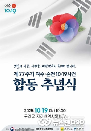 (뉴스인020 = 김성길 기자) 전남 구례군은 여순사건의 역사적 의미를 되새기고 희생자와 유족들을 위로하기 위한‘여순사건 제77주기 정부주최 합동추념식’이 오는 19일 구례군 지리산역사문화관에서 개최된다고 밝혔다.
