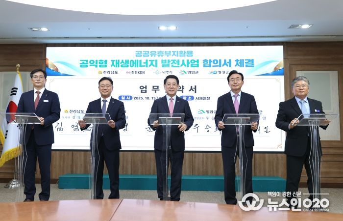 (뉴스인020 = 김성길 기자) 영암군이 15일 전남도청에서 전라남도, 나주시, 영광군, 한전KDN(주)과 ‘공공 유휴부지 활용 공익형 재생에너지 발전사업 업무협약’을 체결했다.