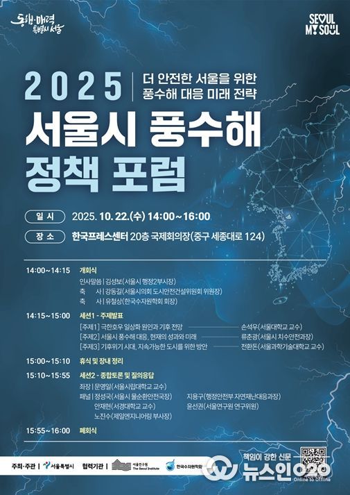(뉴스인020 = 김성길 기자) 서울시는 기후변화로 일상화된 극한호우에 선제적으로 대응하기 위해, 오는 22일 오후 2시 한국프레스센터에서 ‘더 안전한 서울을 위한 풍수해 대응 미래 전략’을 주제로 『2025 서울시 풍수해 정책 포럼』을 개최한다.