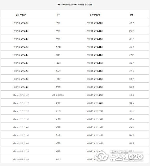 제네시스 포인트 1위 옥태훈(27.금강주택)을 비롯해 2위 이태훈(35.캐나다), 3위 김백준(24.속초아이), 4위 최진호(41.COWELL), 5위 배용준(25.CJ), 6위 문도엽(34.DB손해보험), 7위 최승빈(24.CJ), 8위 신용구(34.금강주택), 9위 송민혁(21.CJ), 10위 사돔 깨우깐자나(27.태국)까지 제네시스 포인트 TOP10 선수들과 36위 정한밀(34.경희), 37위 김동민(27.NH농협은행)까지 제네시스 포인트 상위 36명이 참가자 명단에 이름을 올렸다.