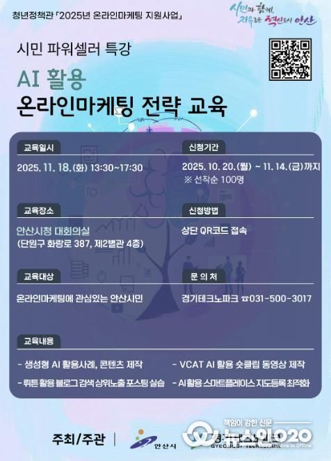 (뉴스인020 = 김성길 기자) 안산시는 다음 달 14일까지 생성형 인공지능(AI)을 활용한 온라인 마케팅 역량 강화 ‘시민 파워셀러’ 6회차 교육생을 모집한다고 20일 밝혔다.