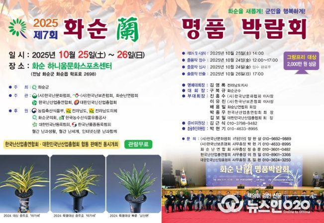 (뉴스인020 = 김성길 기자) 대한민국 난(蘭) 산업의 중심지로 자리매김하고 있는 전남 화순군이 ‘제7회 2025 화순 난 명품 박람회’를 오는 10월 25일부터 26일까지 이틀간 화순 하니움문화스포츠센터 실내체육관에서 개최한다.