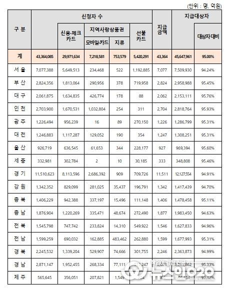 (뉴스인020 = 김성길 기자) 2차 민생회복 소비쿠폰 신청·지급 개시 이후 4주간(9.22(월)~10.19(일)) 지급대상자의 95.0%인 4천336만 명이 신청하고 4조 3천364억 원이 지급되어, 추석 연휴 간 오프라인 신청이 불가능했음에도 불구하고, 대다수 국민들이 소비쿠폰을 신청·지급받은 것으로 나타났다.(10.19. 24시 기준)