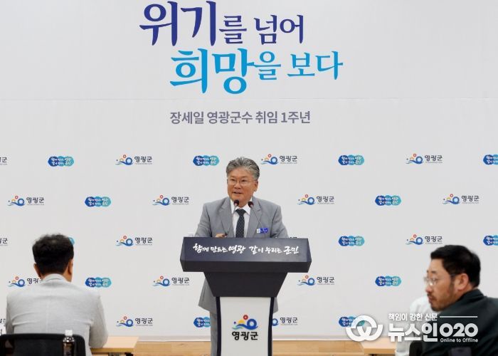 (뉴스인020 = 김성길 기자) 영광군은 21일 군청 대회의실에서 장세일 영광군수 취임 1주년을 맞아 기자단, 부군수, 실·단·과·소장 등 100여 명이 참석한 가운데 ‘취임 1주년 기자회견’을 개최했다. 이번 기자회견은 지난 1년간의 군정 성과와 향후 군정 운영 방향을 공유하고 언론과의 소통을 강화하기 위해 마련됐다.