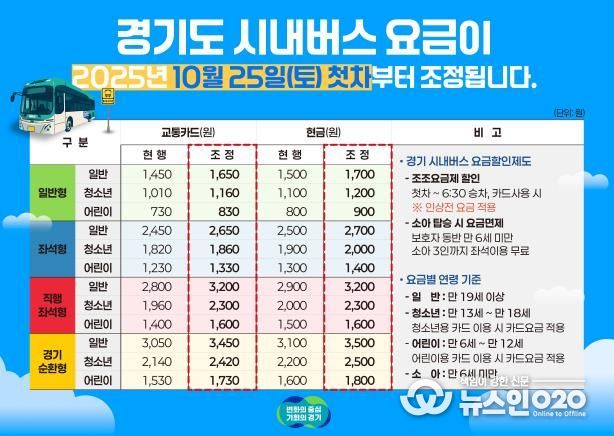 (뉴스인020 = 김성길 기자) 경기도가 어려운 도내 버스업계 경영 상황을 개선하고 안정적인 대중교통 서비스 제공을 위해 25일 첫차부터 시내버스 요금을 조정한다.