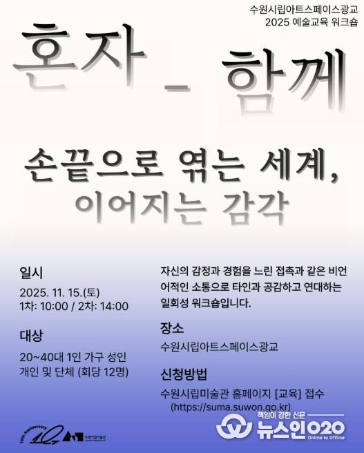 (뉴스인020 = 기자) 경기도 수원시립미술관은 예술을 통해 타인과의 관계를 확장하고 감각을 회복하는 예술교육 워크숍 '혼자-함께'를 11월 15일 수원시립아트스페이스광교에서 개최한다.