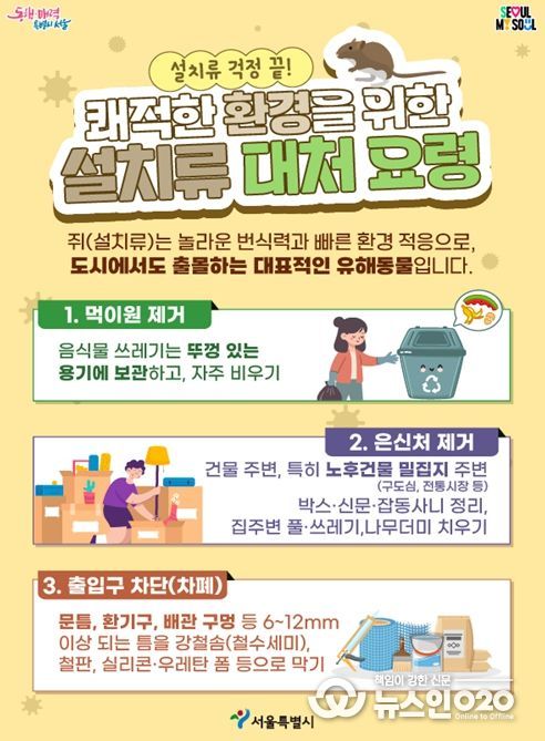 서울시는 구와 함께 하는 ‘통합 방제’도 지속한다. 매월 넷째 주 자치구의 ‘클린 데이’ 활동과 연계해 쥐 출몰 다발 지역을 중심으로 구서 활동과 소독·청소한다.