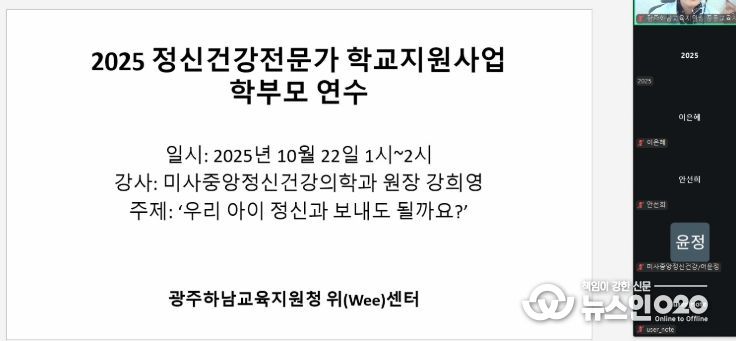 (뉴스인020 = 김성길 기자) 광주하남교육지원청 위(Wee)센터는 10월 22일 관내 초·중·고 학부모 130여 명을 대상으로 ‘우리 아이 정신과 가도 될까요? 정신과에 대한 올바른 이해와 편견 해소’를 주제로 비대면 부모 교육을 진행했다.