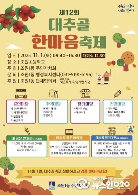 (뉴스인020 = 기자) 수원시 장안구 조원1동 주민자치회와 조원1동 단체협의회는 오는 11월 1일, 지역 주민이 함께 어울리는 ‘제12회 대추골 한마음 축제’를 개최한다.