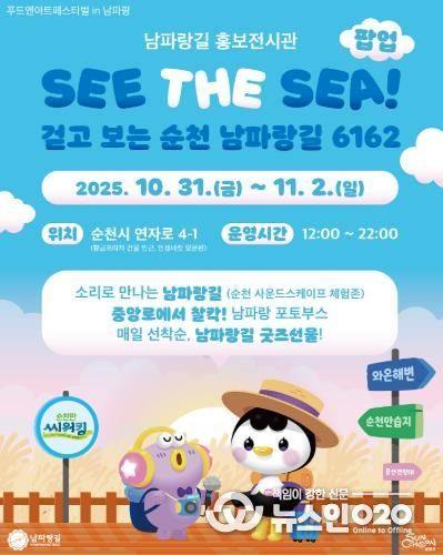 (뉴스인020 = 김성길 기자) 순천시는 푸드앤아트페스티벌이 열리는 중앙로 일대에 남파랑길 홍보 전시관을 운영해 순천의 바다와 길을 ‘소리’로 만나는 감각적인 공간을 마련한다고 밝혔다.