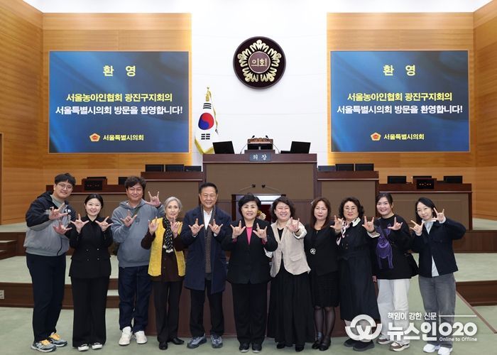 (뉴스인020 = 김성길 기자) 서울특별시의회 보건복지위원회 김영옥위원장(국민의힘, 광진3)은 지난 10월 29일 서울시농아인협회 광진구지회 본회의장 참관 및 의장표창 수여식에 참석해 회원들과 뜻깊은 시간을 가졌다.
