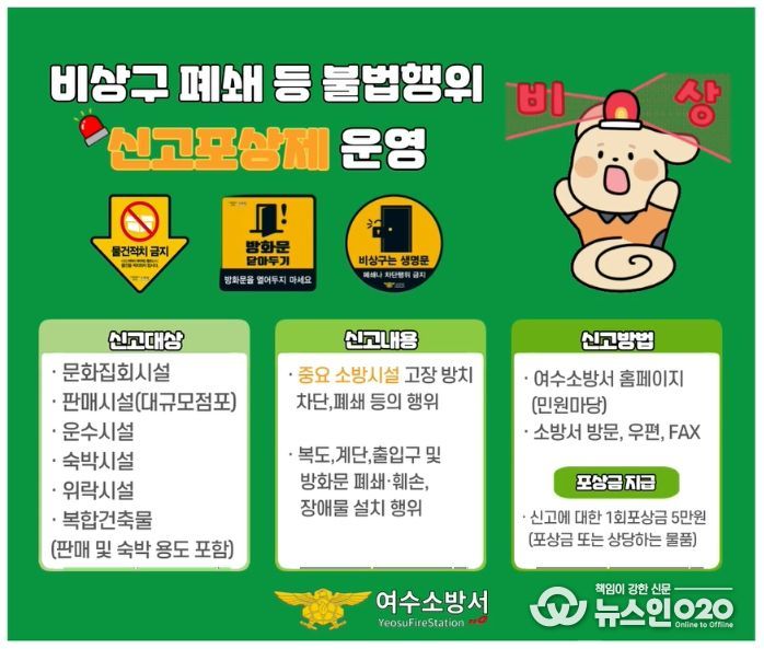 (뉴스인020 = 김성길 기자) 여수소방서(서장 서승호)는 소방시설 및 피난·방화시설의 불법행위를 시민이 직접 신고하면 포상금을 지급하는'소방시설 등 불법행위 신고포상제'를 적극 홍보 중이라고 30일 밝혔다.