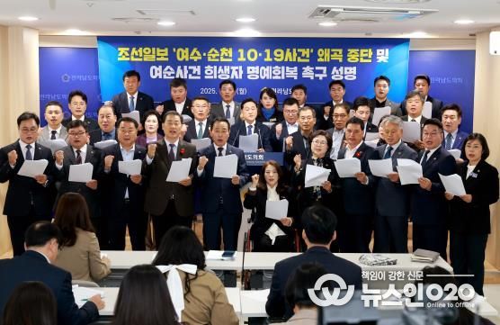 (뉴스인020 = 김성길 기자) 전라남도의회 강문성 의원(기획행정위원장, 더불어민주당, 여수3) 등 전라남도의원들이 11월 3일 조선일보의 '여수·순천 10·19 사건' 왜곡 보도에 대해 강한 유감을 표명하고 희생자 명예회복을 촉구하는 성명을 발표했다.