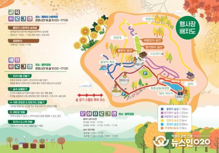 행사 장소는 두 곳에서 진행되며 물맞이골 산림욕장에서는 숲 걷기 스탬프 투어, 숲 해설, 정원 투어가 진행되고, 불무공원에서는 반려식물 만들기, 보물찾기, 숲속 작은 책방, 페이스페인팅, 레트로체험(달고나, 뽑기 등), 김밥만들기 등 아이들과 함께하는 다양한 체험 프로그램이 진행된다.