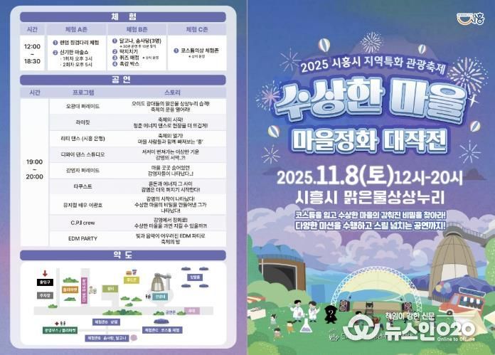 (뉴스인020 = 김성길 기자) 시흥시는 2025년 시흥시 지역특화 관광축제 지원사업 선정 축제인 ‘수상한 마을 마을정화대작전’을 오는 11월 8일 정왕동 맑은물상상누리 일원에서 개최한다. 이번 축제는 시흥시 청년예술연합회가 주관한다.