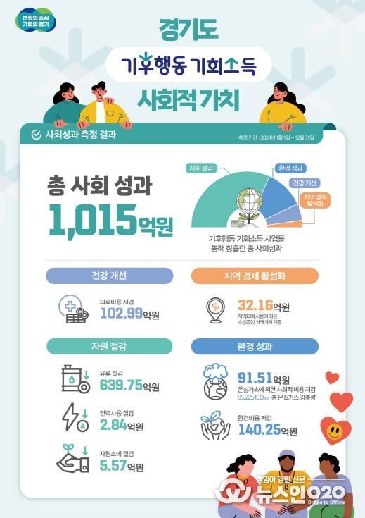 (뉴스인020 = 김성길 기자) 경기도가 ‘기후행동 기회소득’ 사업의 사회적 성과를 정량적으로 측정한 결과, 2024년 한 해 동안 총 1,015억 원의 사회적 가치가 창출됐다는 조사결과가 나왔다. 특정 정책사업의 환경적·경제적·사회적 효과를 금액으로 환산해 분석한 것은 이번이 국내 지방정부 가운데는 처음이다.