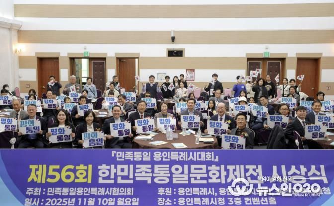(뉴스인020 = 김성길 기자) 용인특례시는 10일 시청 컨벤션홀에서 민족통일 용인특례시협의회 주관으로 ‘민족통일 용인특례시대회와 제56회 한민족통일문화제전 시상식’이 열렸다고 밝혔다.