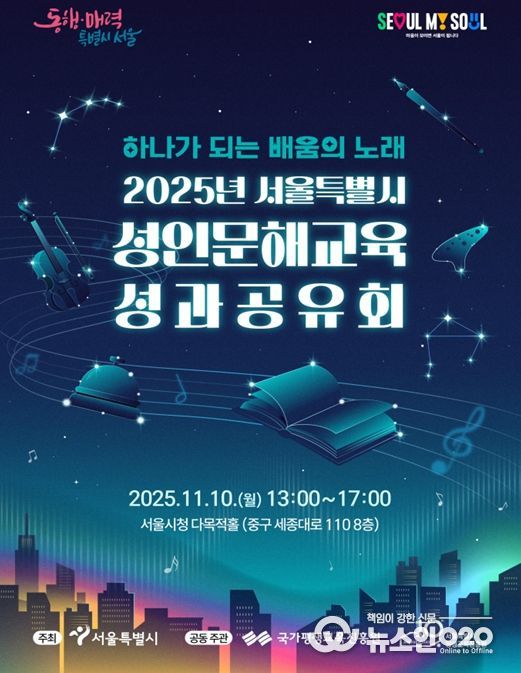 (뉴스인020 = 김성길 기자) 서울시평생교육진흥원은 ‘하나가 되는 배움의 노래’를 주제로 10일 13시부터 17시까지 서울시청 본청 8층 다목적홀에서 ‘2025년 서울시 성인문해교육 성과공유회’를 개최했다. 이번 행사는 성인 문해학습자들이 한 해 동안의 학습 여정에서 얻은 경험과 결실을 나누고, 새로운 배움에 대한 열망을 확인하는 장으로 마련됐다.