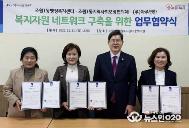 (뉴스인020 = 기자) 수원시 장안구 조원1동 지역사회보장협의체는 지난 11일, 관내 ㈜아주편한과 함께 복지자원 네트워크 구축을 위한 업무협약식을 추진했다.