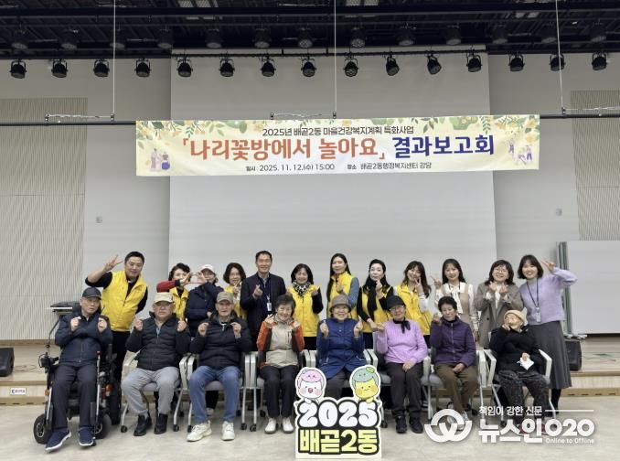 (뉴스인020 = 김성길 기자) 배곧2동 지역사회보장협의체는 지난 11월 12일 ‘나리꽃방에서 놀아요’ 결과보고회를 개최하며 1년간의 활동을 마무리했다. 이번 행사는 사업에 참여한 어르신과 협의체 위원들이 함께 모여 그동안의 성과를 공유하고 서로에게 감사의 마음을 전하는 자리로 마련됐다.