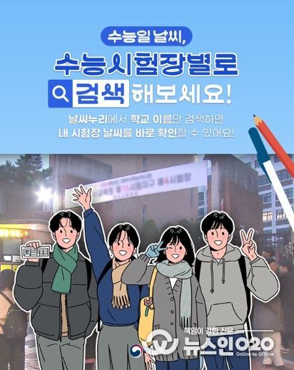(뉴스인020 = 김나현 기자) 날씨누리에서 학교 이름만 검색하면 내 시험장 날씨를 바로 확인할 수 있어요!