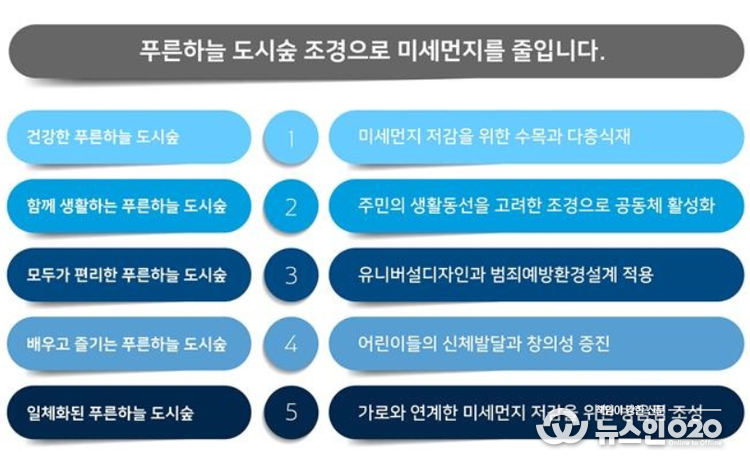 다섯 개의 실행 전략을 보면, 첫째 미세먼지에 대응하는 ‘건강한 푸른하늘 도시숲’을 만든다. 미세먼지저감 효과가 우수하고 경관적으로도 미려한 나무들을 식재하며, 보행통로 주변에는 다층 식재로 미세먼지저감 및 차단효과를 극대화한다.