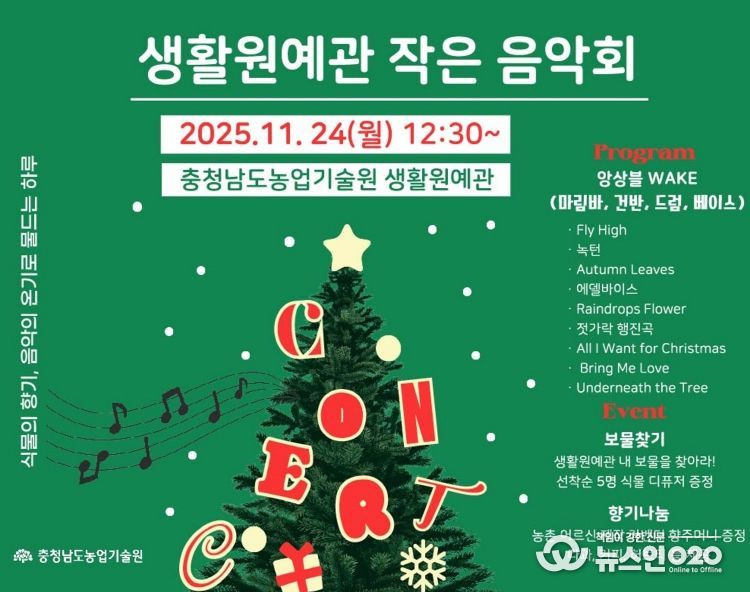 (뉴스인020 = 김성길 기자) 충남도 농업기술원은 오는 24일 예산군 신암면 기술원 내 생활원예관에서 ‘작은 음악회’를 개최한다고 18일 밝혔다.
