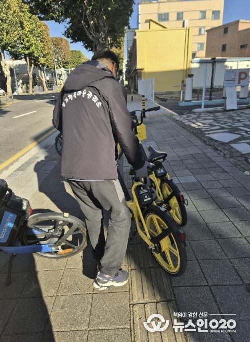 (뉴스인020 = 기자) 수원시 팔달구 행궁동 경기행복마을관리소는 행궁동 일대를 순찰하며 무질서하게 방치된 공유자전거와 공유킥보드를 정비·이동시키는 환경정비 활동을 꾸준히 실시하고 있다.