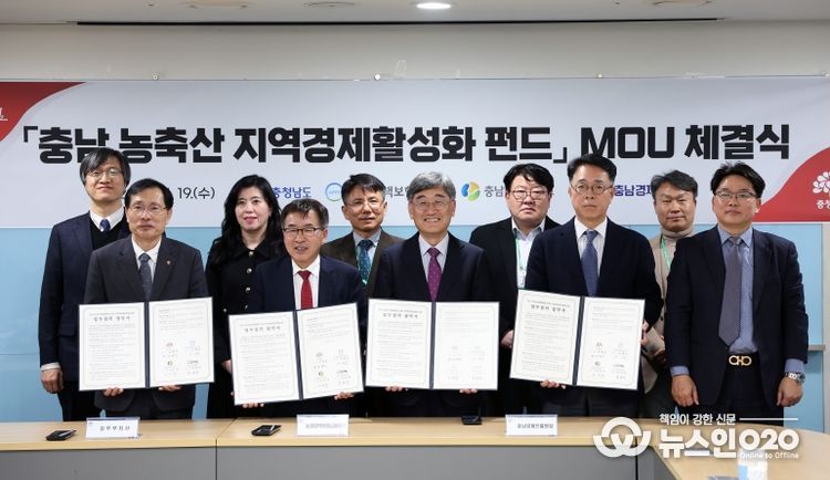 (뉴스인020 = 김성길 기자) 충남도는 19일 도청에서 농업정책보험금융원, 충남테크노파크, 충남경제진흥원과 ‘충남 농축산 지역경제 활성화 펀드’ 업무협약(MOU)을 체결했다.