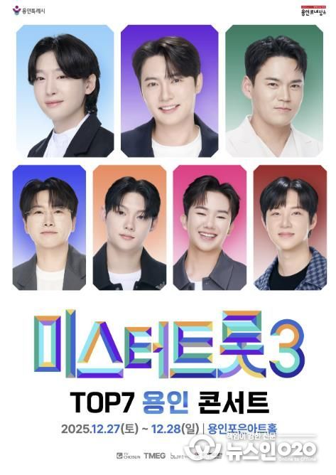 (뉴스인020 = 김성길 기자) 용인문화재단은 오는 12월 27일부터 28일까지 용인포은아트홀에서 ‘미스터트롯3 TOP7 콘서트’를 선보인다. 공연은 27일 오후 1시·6시, 28일 오후 1시 총 3회 진행된다.