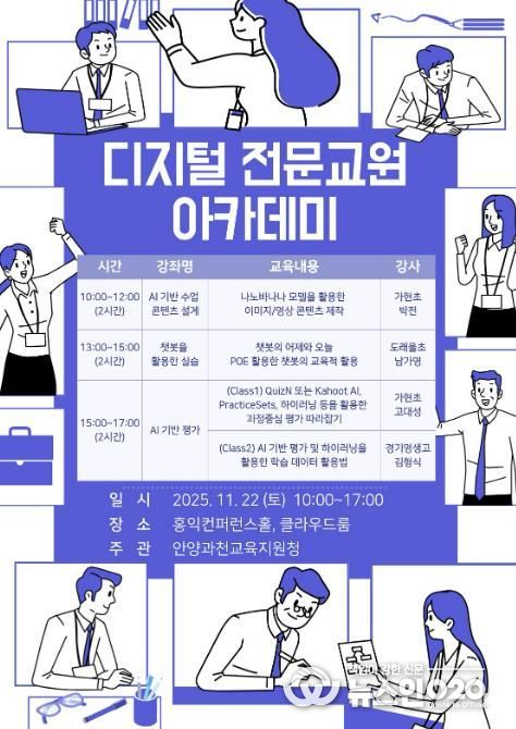 (뉴스인020 = 김성길 기자) 경기도안양과천교육지원청은 11월 22일, 디지털 역량을 체계적으로 강화하기 위한 디지털 전문교원 아카데미 연수를 운영했다. 이번 전문과정에는 관내 초등 교원 30명이 참여해 AI 기반 수업 콘텐츠 설계, 챗봇을 활용한 실습, AI기반 평가, 디지털 문해력 기반 수업 혁신 전략 등 심화 전문 영역을 학습했다.