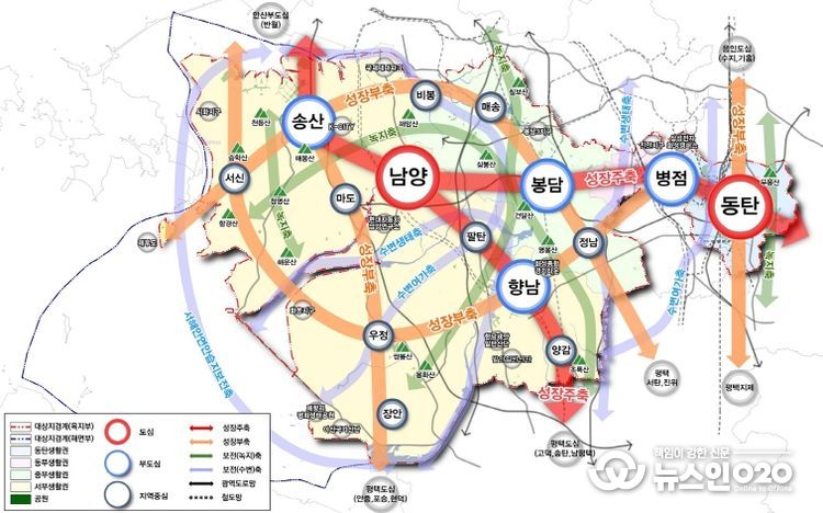 생활권은 동탄, 동부, 중부, 서부 총 4개 권역으로 계획했으며 ▲동탄생활권은 신산업 생태계 구축 및 친환경 생태도시 기반 마련 ▲동부생활권은 광역환승거점 조성을 통한 원도심 정비 및 관광산업 육성 ▲중부생활권은 산·학·연 연계 네트워크 조성 및 녹색관광벨트 구축 ▲서부생활권은 자동차·바이오 등 신성장산업 연계 클러스터 구축과 해양 관광산업 육성을 발전전략으로 제시했다.