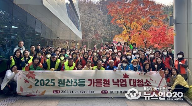 (뉴스인020 = 김성길 기자) 광명시 철산3동 행정복지센터는 26일 가을철을 맞아 9개 유관단체 단체원과 직원, 지역 주민 등 100여 명이 참여한 가운데 빗물받이 주변과 길거리 낙엽을 정리하는 대청소를 실시했다.