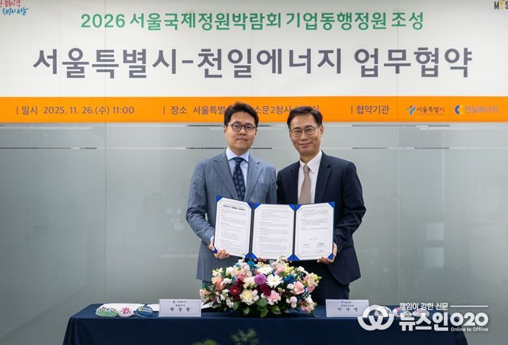 (뉴스인020 = 김성길 기자) 서울시는 2026년 서울숲에서 개최되는 서울국제정원박람회 내에 기업동행정원 조성을 위해 ESG 경영에 힘쓰고 있는 천일에너지와 11월 26일 업무협약을 체결했다.