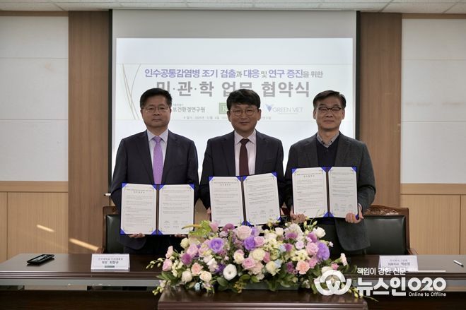 (뉴스인020 = 김성길 기자) 서울시보건환경연구원은 건국대학교 수의과대학, ㈜그린벳과 인수공통감염병 및 반려동물 항생제내성 조사·연구를 위한 민·관·학 상호 업무협약을 체결했다.